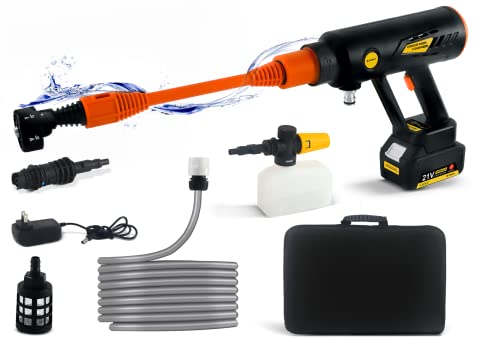 - 【EASY TO USE】This cordless washer gun has a LCD display screen to check the remaining battery power. It’s compact and lightweighted, supports quick assembly and can be used anywhere without annoying power cord. There is no need to worry about water source as its self-priming function can draw water from any source. A good partner for outdoor bikes, motorcycles cleaning.