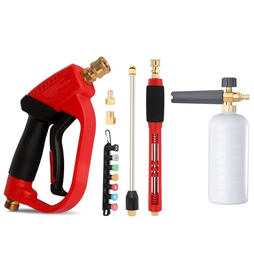 - ✅【Specification】:The pressure washer gun is equipped with a 1/4-inch outlet quick connector, which can easily connect the extension rod, nozzle and foam monitor.The package is equipped with a water gun, a pressure washer wand,an extension rod ,3 Conversion Joints,a nozzle seat and 7 nozzles with different angles: 0 °, 15 °, 25 °, 40 °, 65 °, Rinse,and soap spray modes.