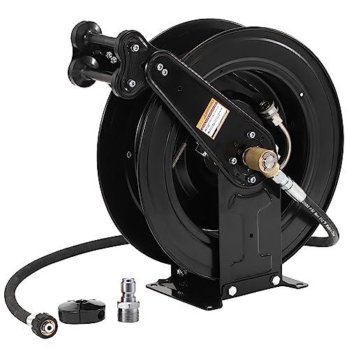 - 【Great Compatibility】The power washer hose reel also comes with a 3/8" QC Plug to M22 14mm male adapter, 360°swivel water inlet joint (3/8" NPT female thread) and a 4 FT inlet hose (M22 14mm female+3/8" NPT male swivel thread), fits most pressure washer hoses, air hoses, oil hoses, and pressure washers. Working pressure: 4000 PSI. Max temperature: 212℉ / 100℃