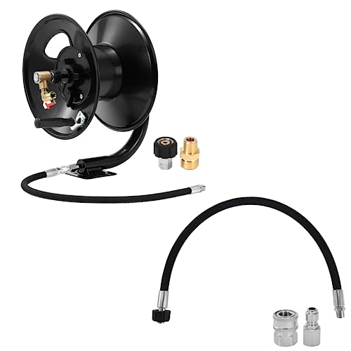 - Specifications: Pressure washer reel is capable of holding 100 feet of hose (not included), with a max PSI of 4000 . It is compatible with 3/8" NPT male end and M22 female end.